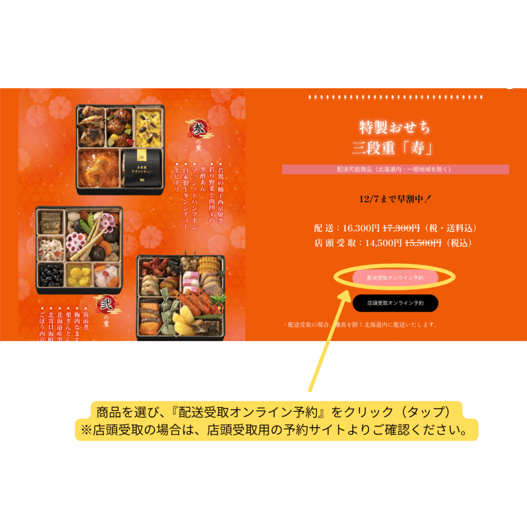- トップページで商品を選び、『配送受取オンライン予約』をクリック(タップ)します。