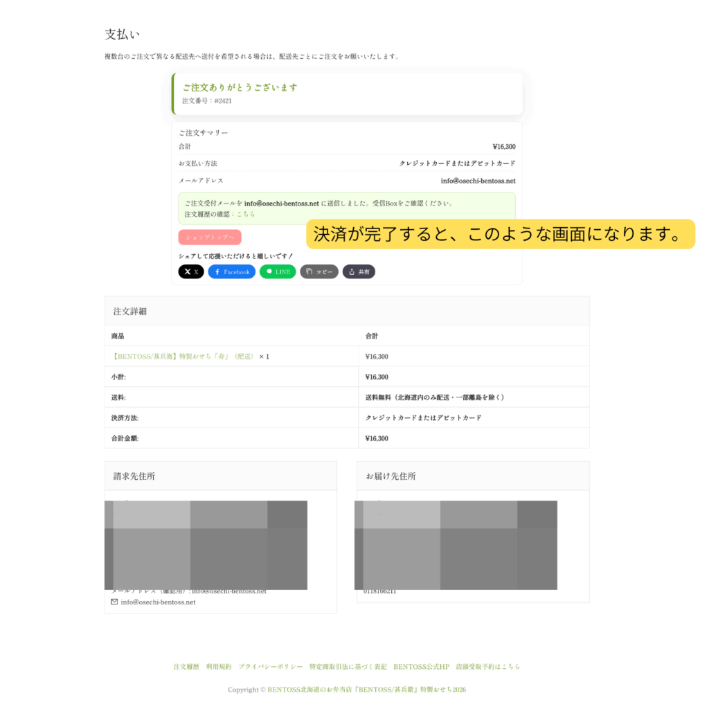 - 決済完了のメッセージが表示されます。