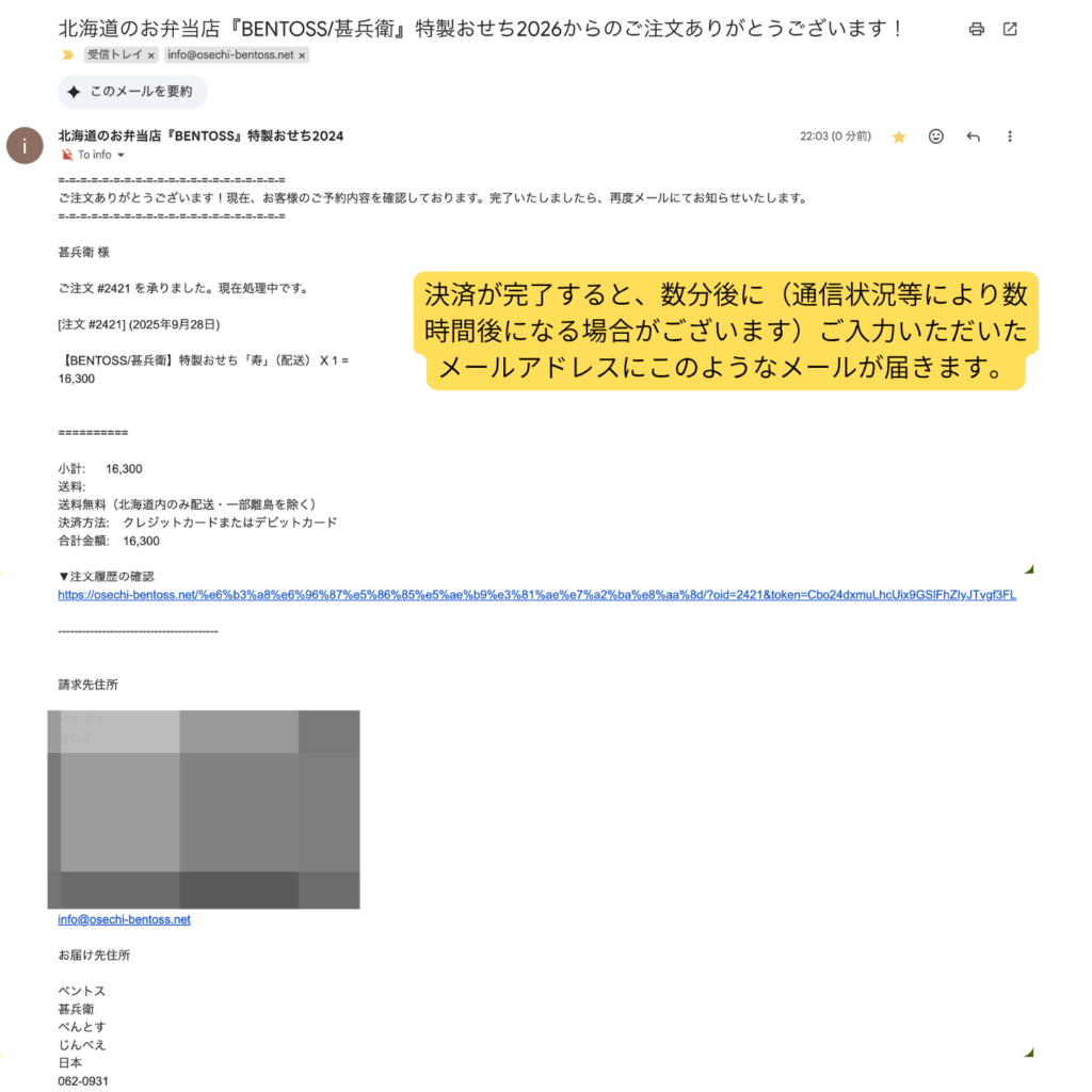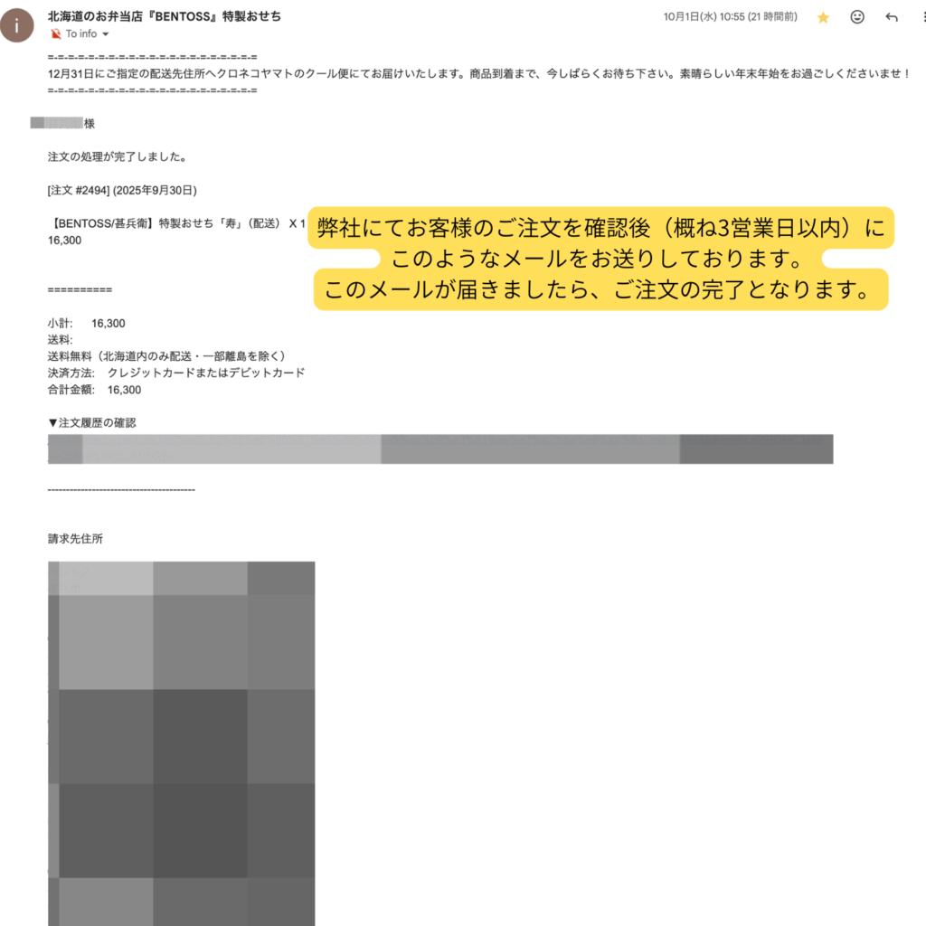 - ご注文の処理が完了しましたら、「確認完了メール(ご注文控えメール)」が届きます。