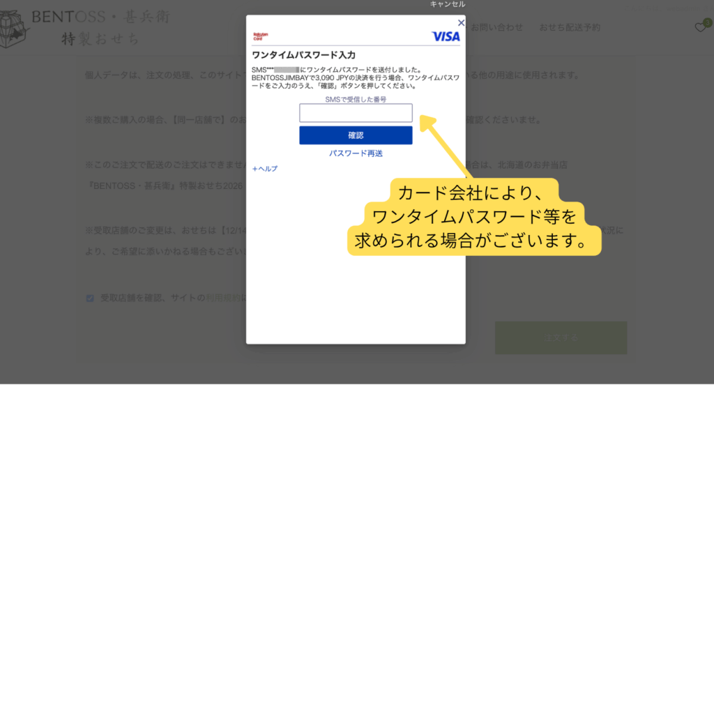 - ご利用のカード決済会社により、ワンタイムパスワードの入力等の確認画面が表示される場合がございます。