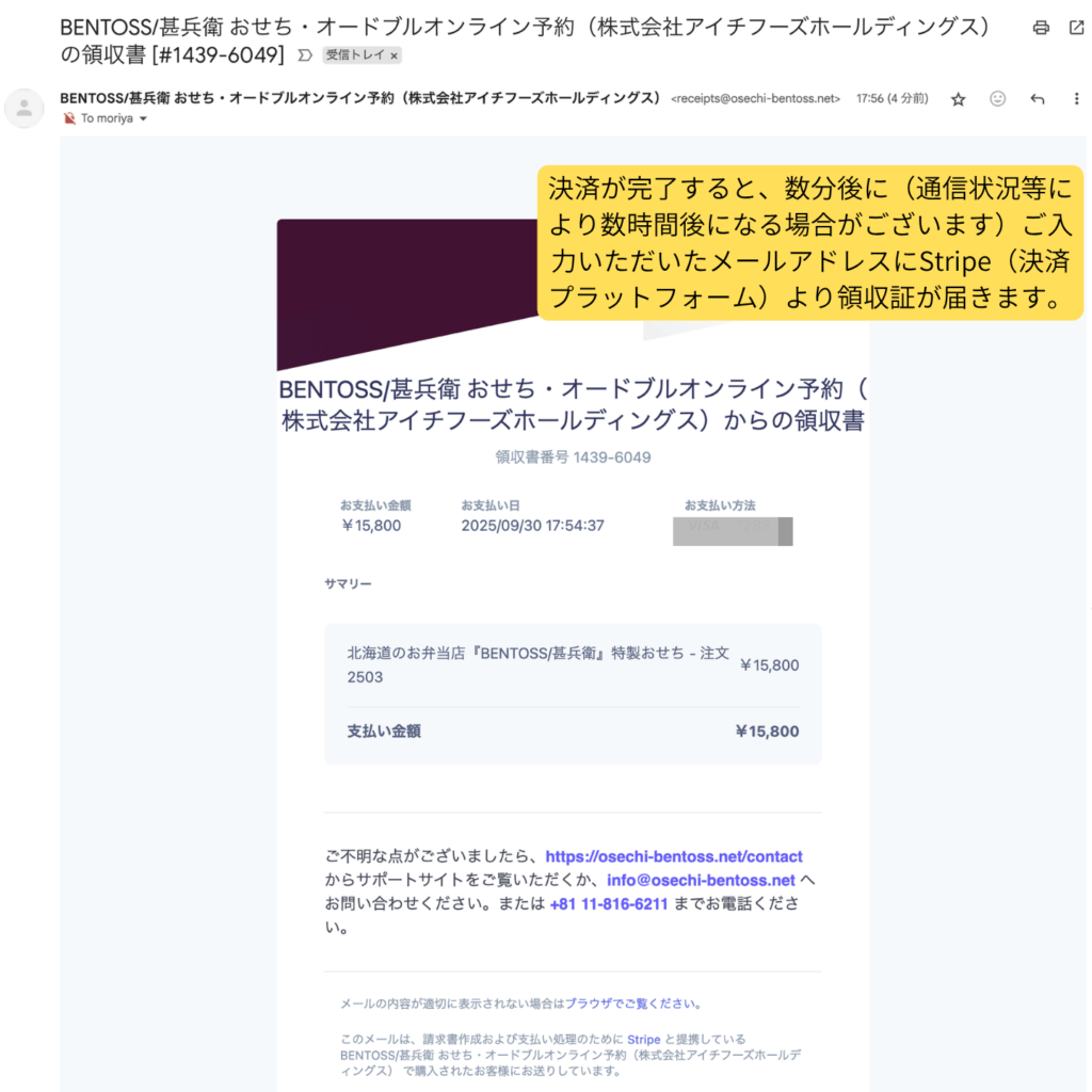 - 入力したメールアドレス宛に「ご注文確認メール」とStripe(決済プラットフォーム)からの領収証がメールで届きます。